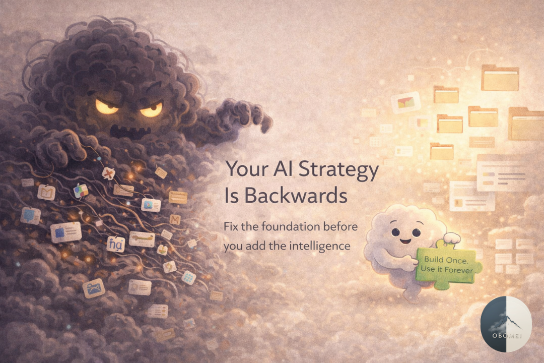 Most companies build their AI strategy in the wrong order: tools first, organization later. The result is expensive software amplifying existing chaos rather than creating clarity. This guide presents a three-phase framework for AI implementation that actually works: fix your information architecture, introduce AI on clean foundations, then automate what's proven. Drawing on research in organizational knowledge management (DeLong, 2004), queueing theory (Little, 1961), and cognitive load (Miller, 1956), you'll learn why most AI projects underdeliver and what the companies getting real results are doing differently. Along the way, we'll connect this framework to practical artifacts from Obomei's Build Once, Use Forever series [1]: reusable operational systems that give your information architecture the structure AI needs to deliver on its promise.